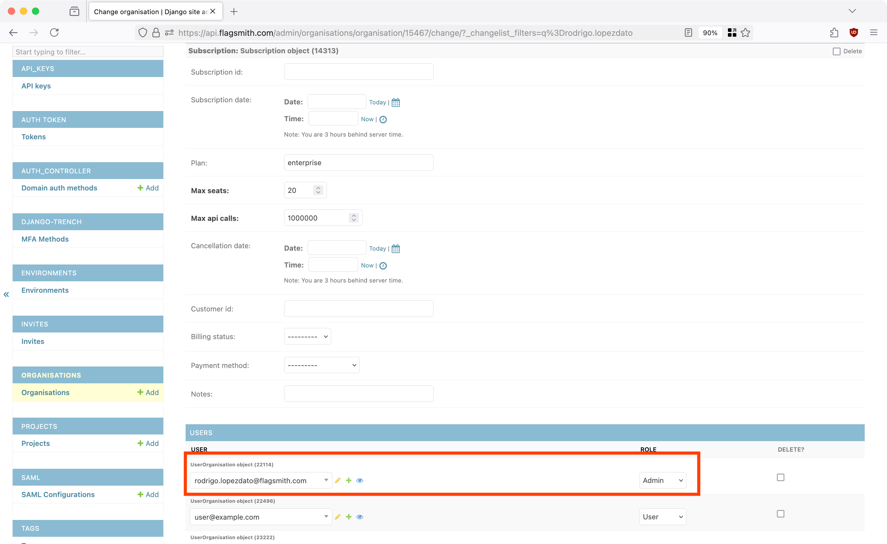 After you import an organisation, you will need to add your Flagsmith user to it. To do this, edit the imported organisation from Django Admin and add your user to it with Admin permissions: